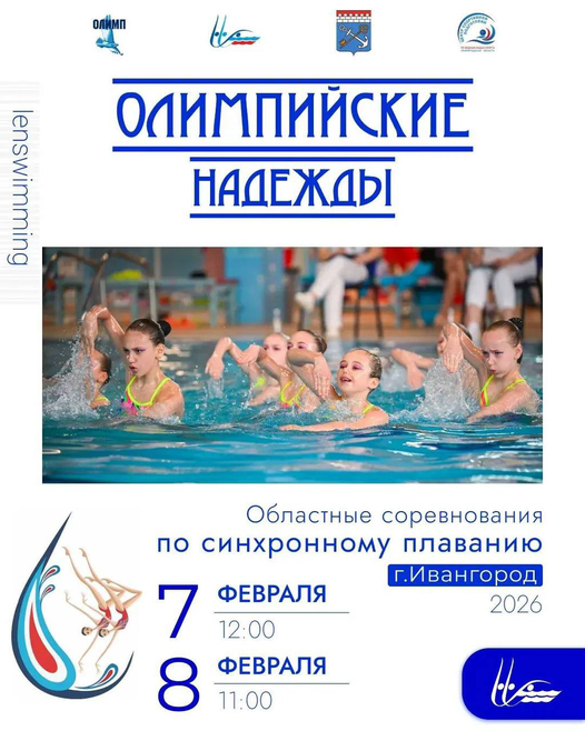 7-8 февраля 2026 года в Ивангороде, Ленинградская область в бассейне МАУ «ОЛИМП» состоятся областные соревнования по синхронному плаванию «ОЛИМПИЙСКИЕ НАДЕЖДЫ».